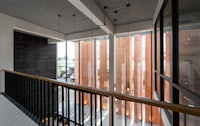 A gigantic wall of 7.5-meter height at the front facing west is divided into several strips, various in sizes and thickness levels, parting and overlapping freely from different angles and directions. Covered by brownish-orange terracotta tiles, the wall stands high to support a translucent roofing panel where many small lights strung in rows like waves. These decorative elements on the front of the two-story house in Pak Kret, Nonthaburi, Thailand not only shade the house from direct sunlight but also intentionally create an interplay between natural sunlight and the light after dark: a lively area of a conversation with light.